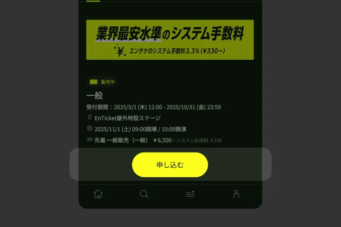 公演ページを開き、ご希望の券種・条件の「申し込む」ボタンを選択してください。
