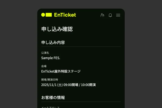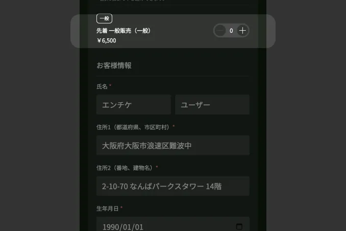 チケットのお申し込みに必要な、氏名・電話番号・住所などの情報を入力してください。