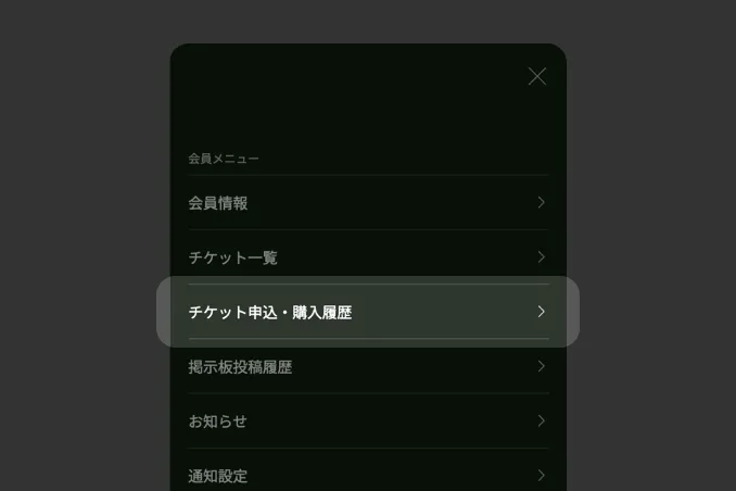 - 1. メニューから「チケット申込・購入履歴」を開く