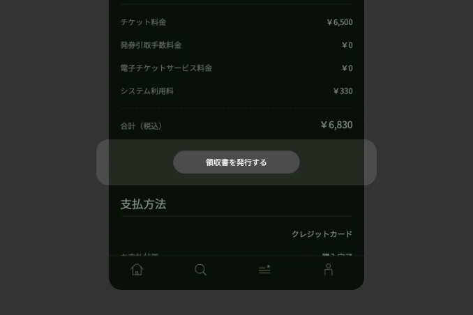 クレジットカード決済やPayPayなど、コンビニ決済以外の方法で購入されたチケットについては、当サービスの「チケット申込・購入履歴」画面から、領収書を表示・印刷できます。