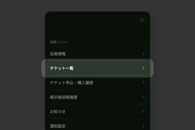 エンチケにログイン後、画面右上の「≡」メニューボタンをタップし、「チケット一覧」を選択します。